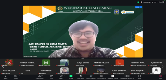 Webinar inspiratif prodi Binsi Digital dan Kewirausahaan, Fakultas Teknik dan Bisnis Universitas Madani, yang diselenggarakan pada hari Kamis, 26 Februari 2026 kali ini mengangkat tema besar pengembangan kapasitas mahasiswa yang menghadirkan tiga narasumber dengan perspektif yang saling melengkapi antara dunia akademik dan praktik bisnis. Pada sesi pertama, bertajuk “Dari Kampus ke Dunia Nyata: Bisnis Tumbuh, Akademik Berprestasi”, Masyitoh Annisaush, Sholiha, S.H.,M.Sc., dosen Bisnis Digital UII dan praktisi bisnis lulusan LPDP Award, menekankan pentingnya membangun keseimbangan antara capaian akademik dan pengalaman kewirausahaan. Ia menjelaskan bahwa mahasiswa tidak perlu menunggu lulus untuk memulai usaha. Justru, bangku kuliah adalah laboratorium terbaik untuk menguji ide, membangun jejaring, serta mengasah daya tahan mental sebagai entrepreneur. Dengan manajemen waktu dan visi yang jelas, prestasi akademik dan pertumbuhan bisnis dapat berjalan beriringan.